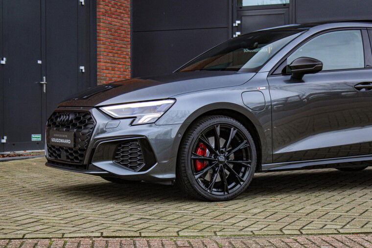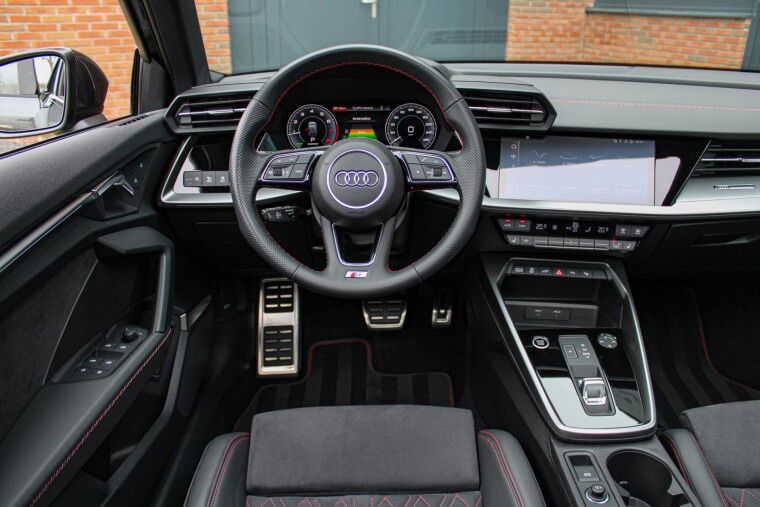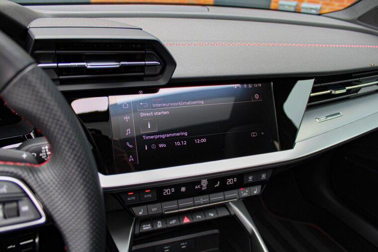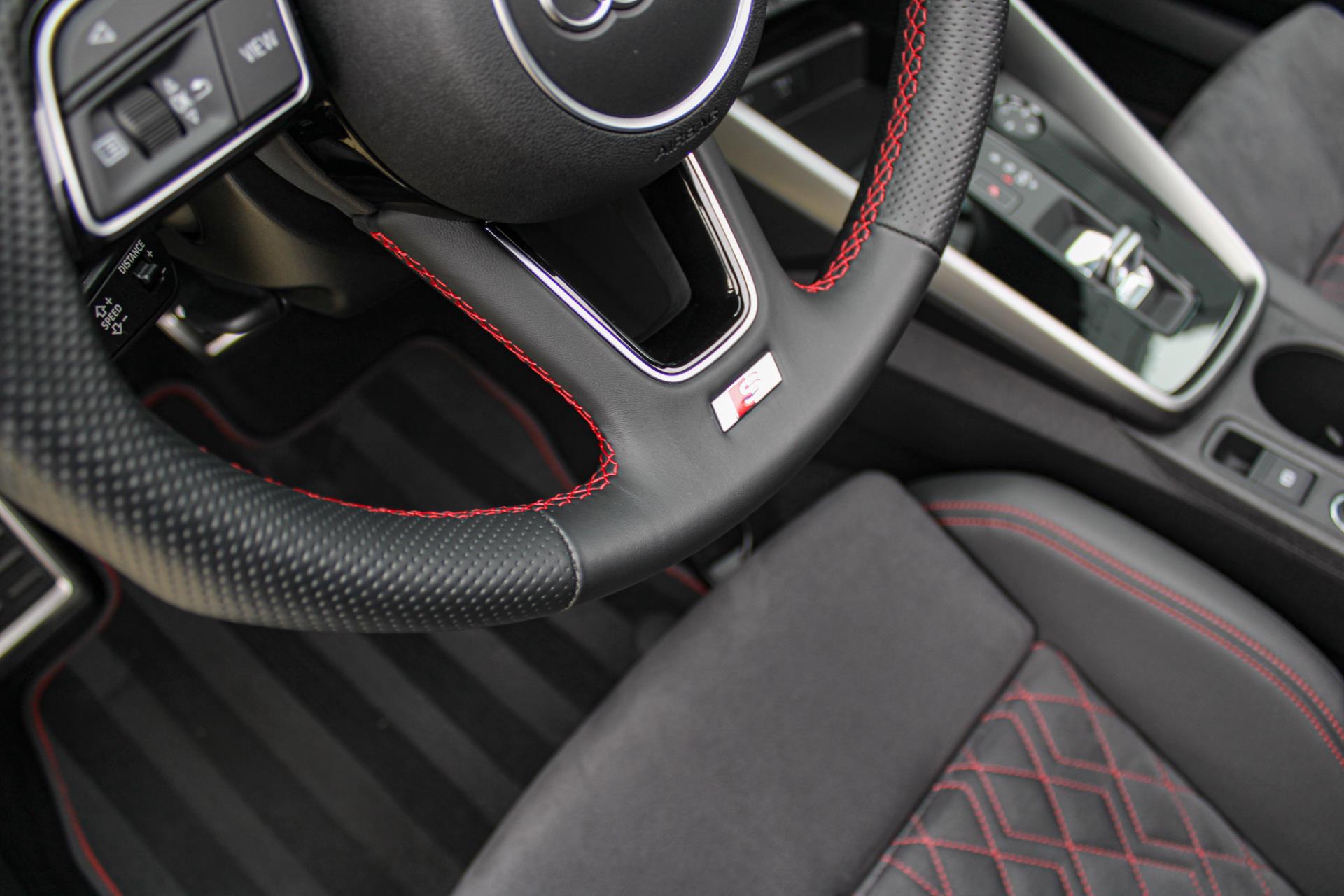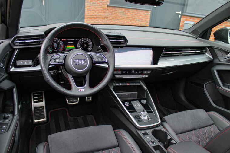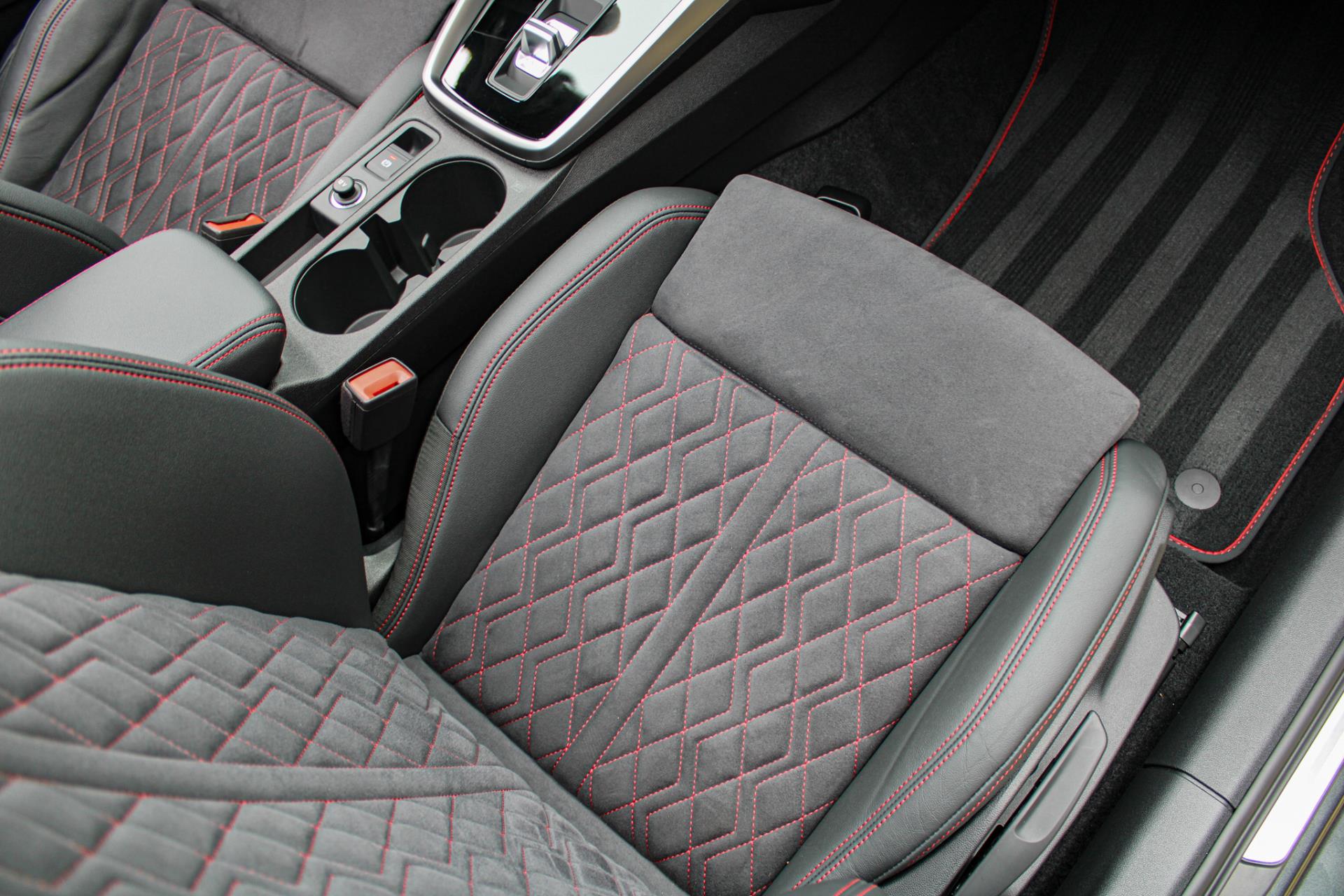 Zeer complete 2022 Audi A3 45 TFSIe in daytonagrijs metallic met zwart optiek. Voorzien van carbon details en de alcantara/lederen zetels met stiksel in Audi Sport Rood. UNIEK!