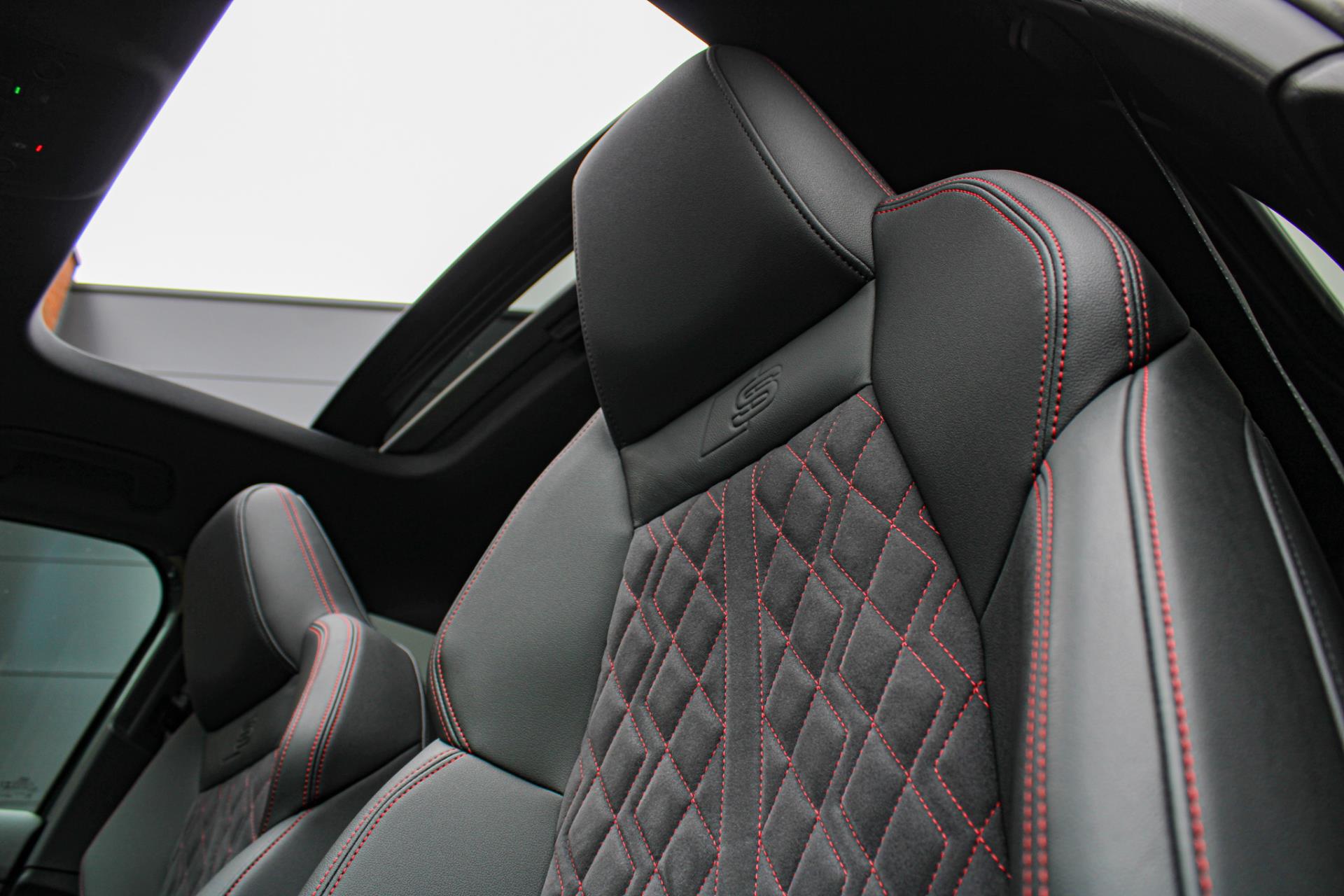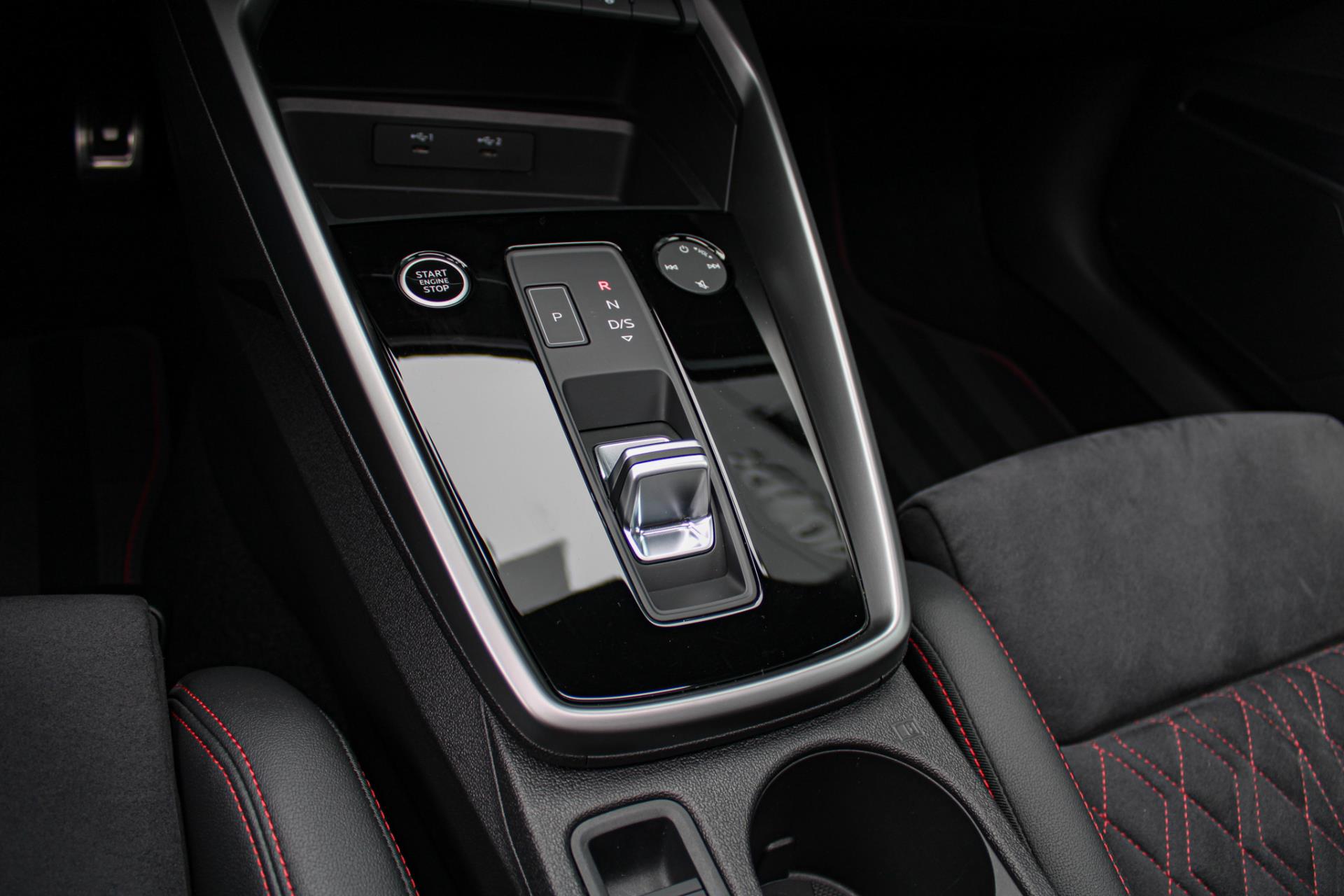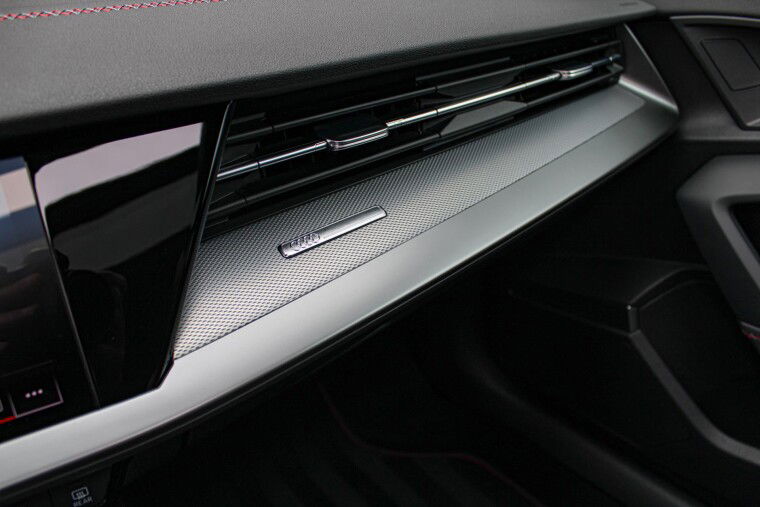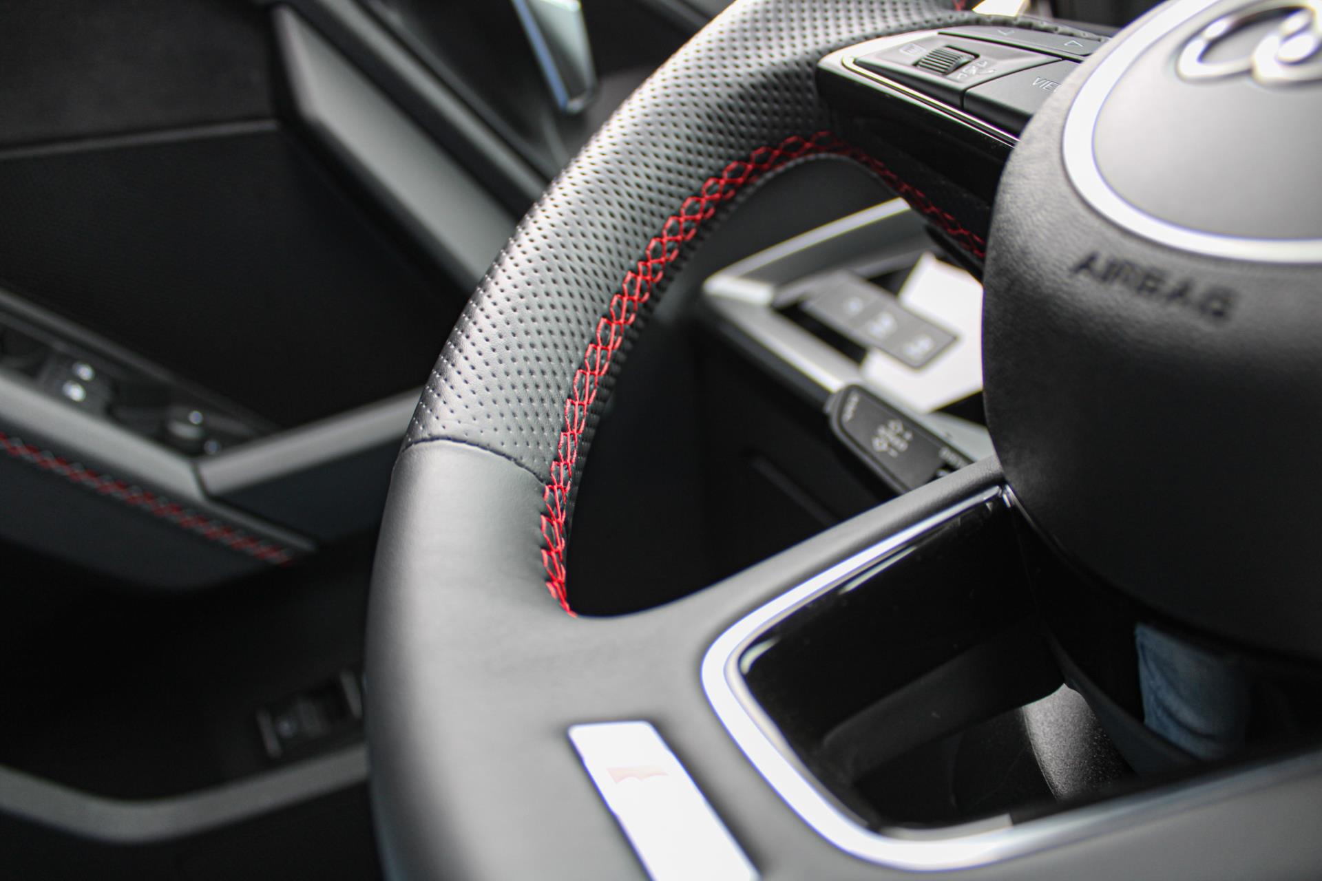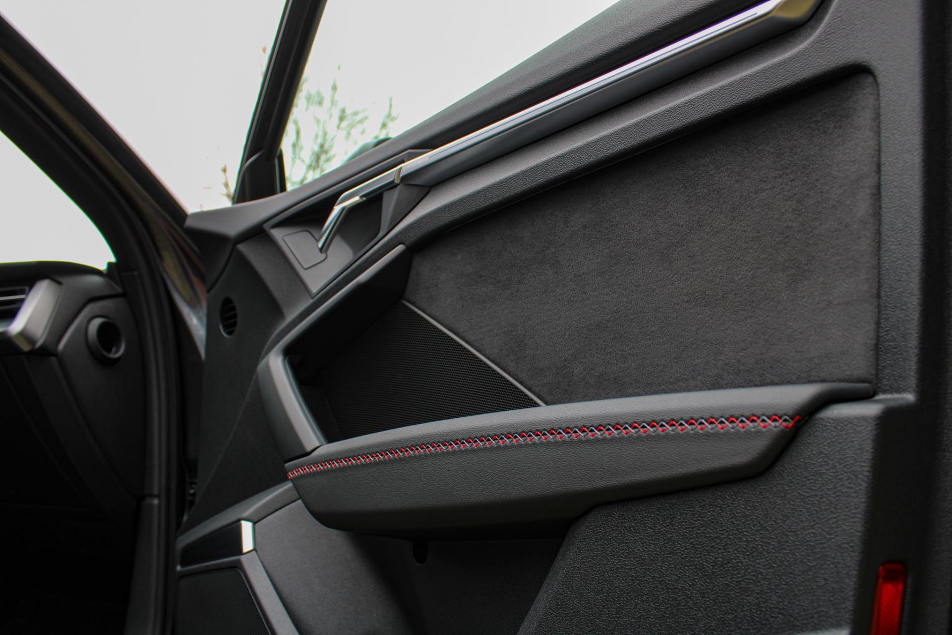 Zeer complete 2022 Audi A3 45 TFSIe in daytonagrijs metallic met zwart optiek. Voorzien van carbon details en de alcantara/lederen zetels met stiksel in Audi Sport Rood. UNIEK!