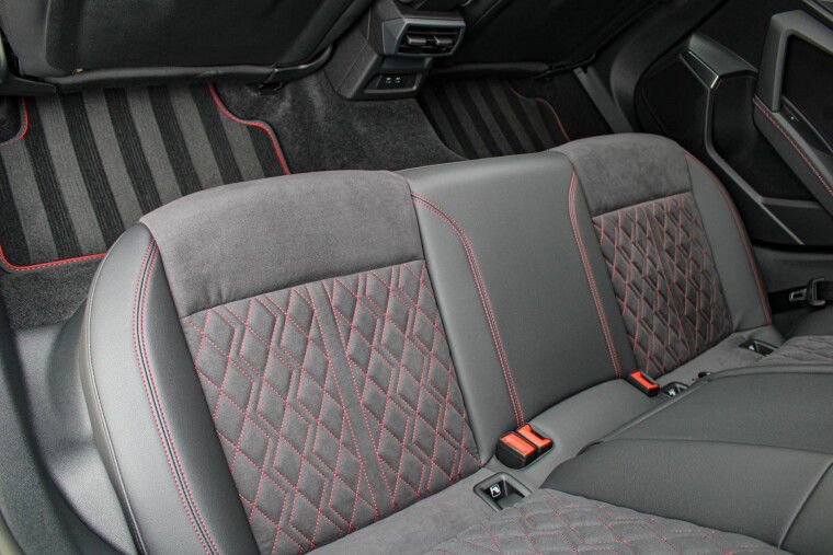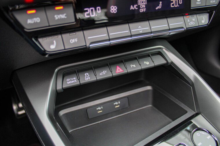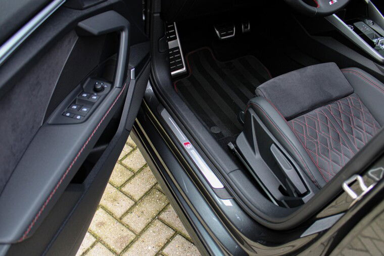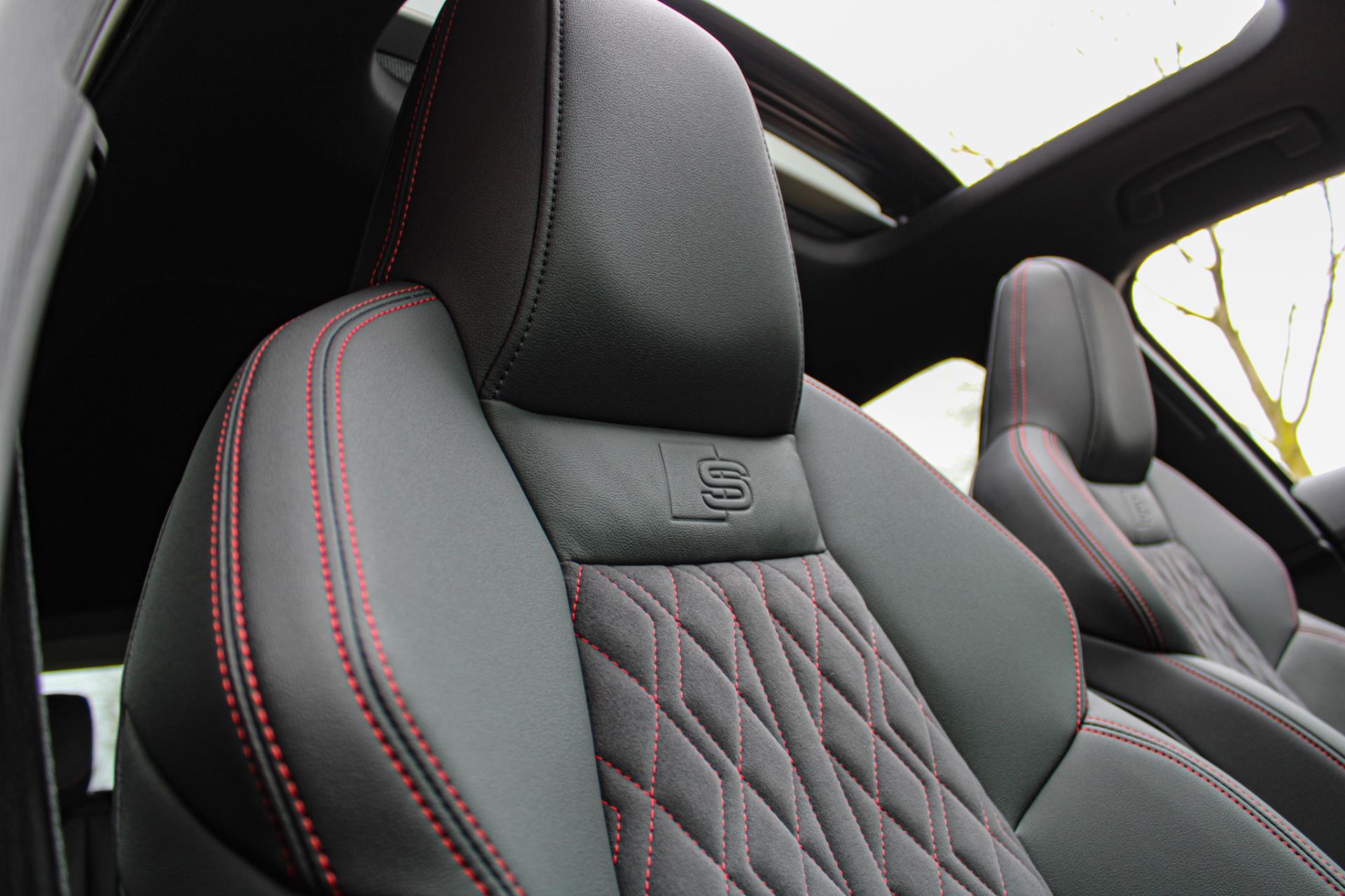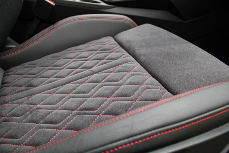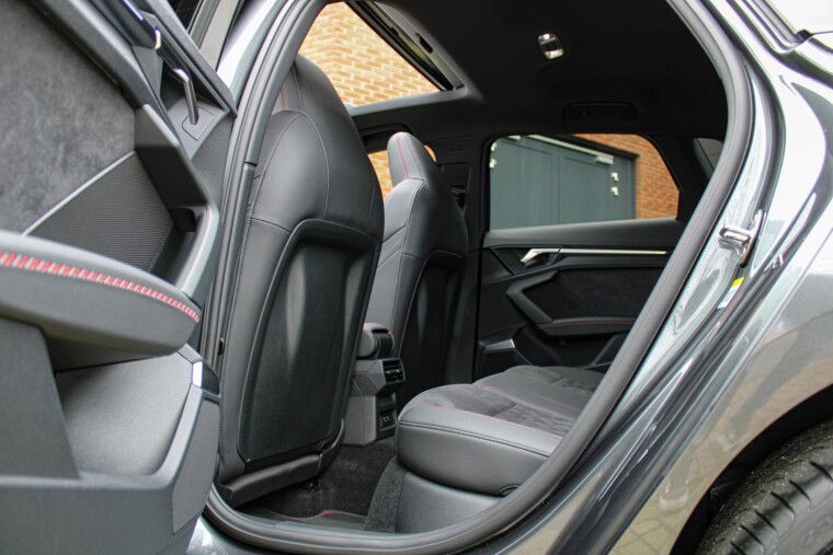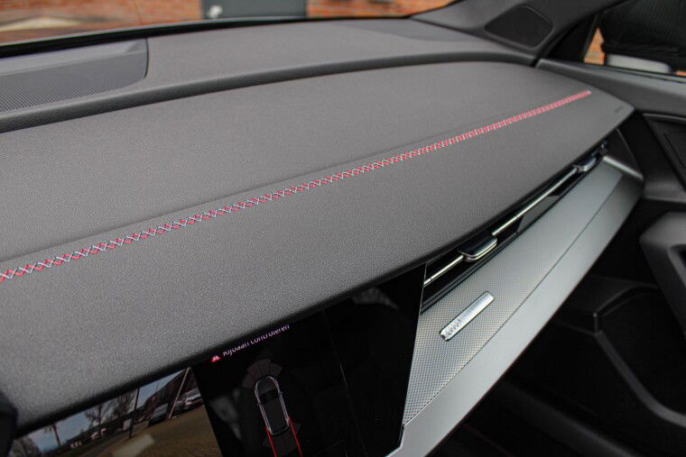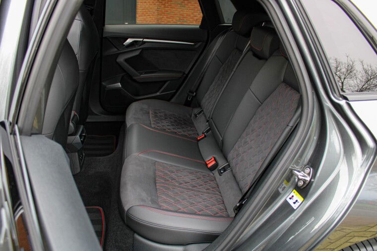 Zeer complete 2022 Audi A3 45 TFSIe in daytonagrijs metallic met zwart optiek. Voorzien van carbon details en de alcantara/lederen zetels met stiksel in Audi Sport Rood. UNIEK!