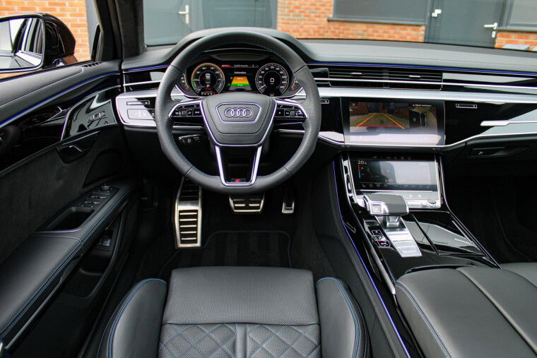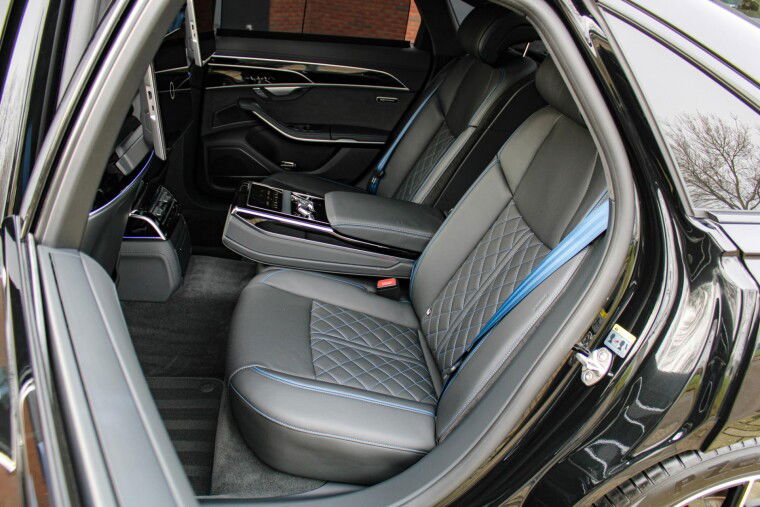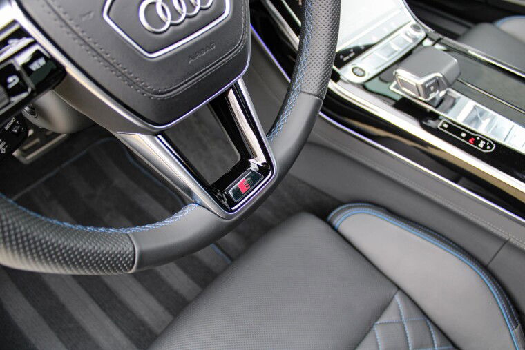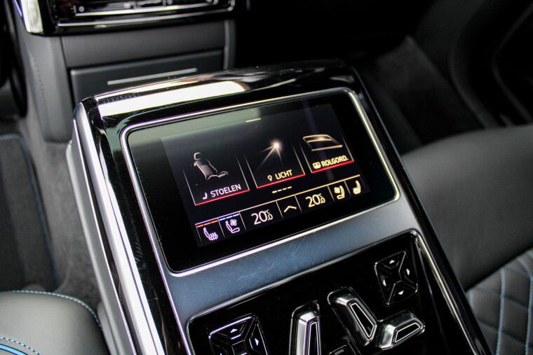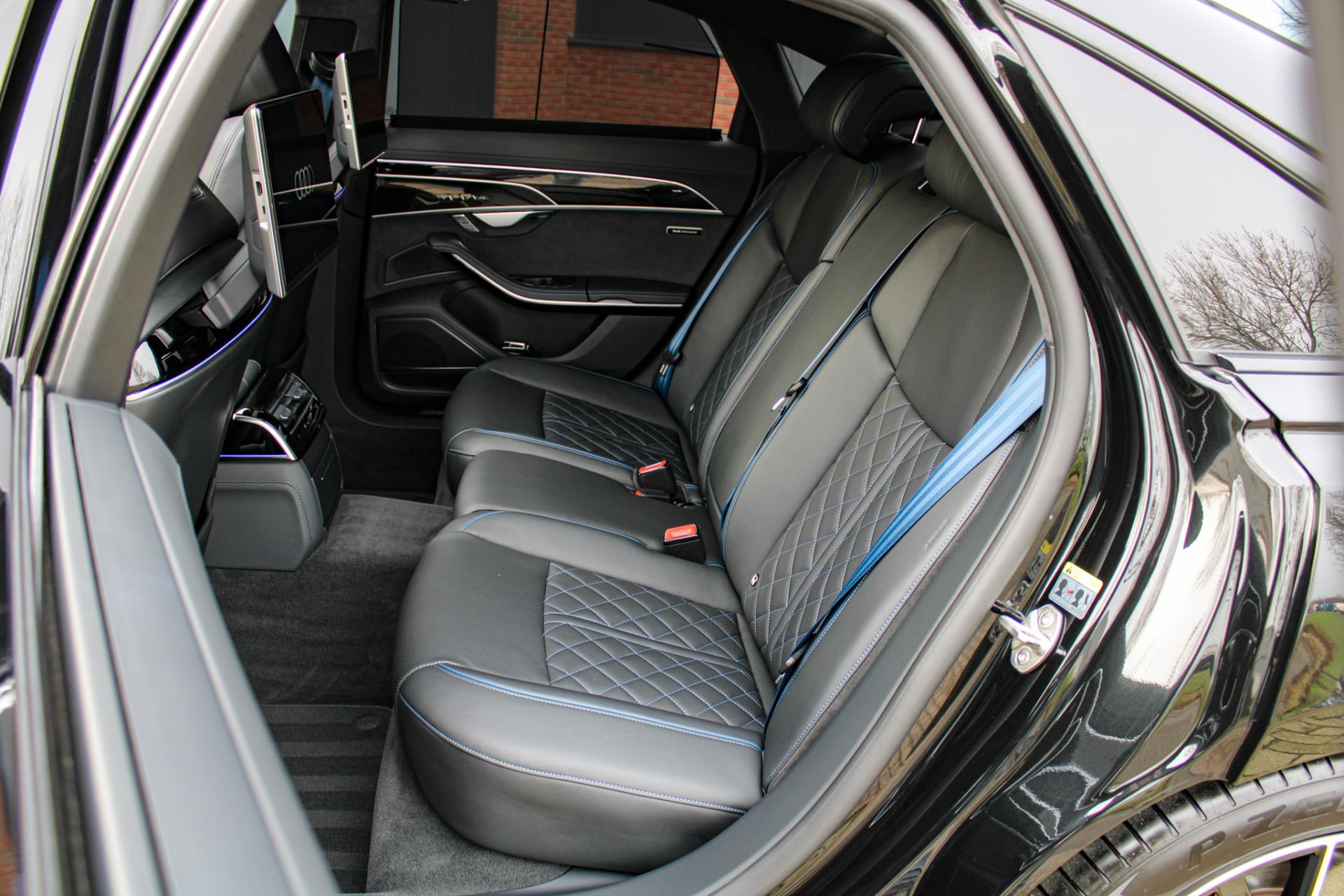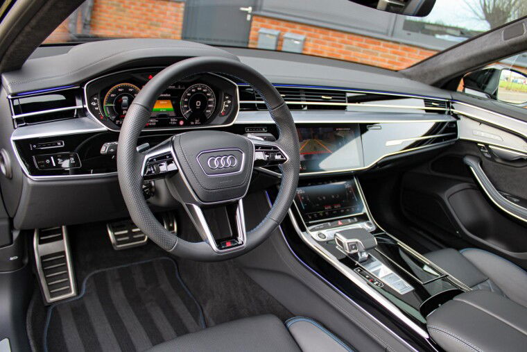 Met trots bieden we u aan, deze smaakvol geconfigureerde 2022 Audi A8 60 TFSIe 61.100KM met exclusive interieur. Gekozen is voor het Audi Exclusive designpakket zwart-oceaanblauw: zwart nappa leder met ruitpatroon en contrasterende stiksels in oceaanblauw.